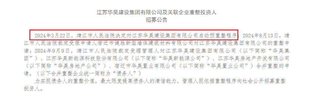 4月8日,全国企业破产重整案件信息网发布《江苏华昊建设集团及关联企业招募投资人公告》。江苏华昊建设集团被破产清算。