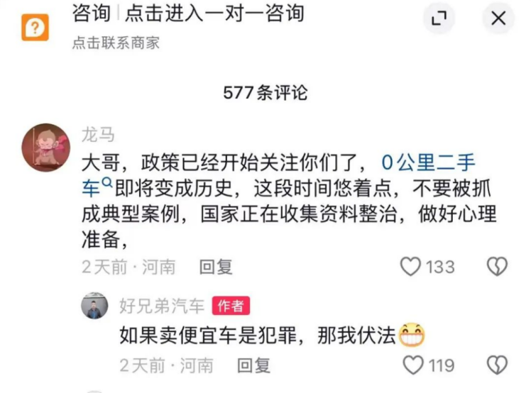 从消费者的角度,“0公里二手车”虽然比新车便宜,但存在显著的风险。比如三包政策凭证就形同虚设。举个例子,您要是在山东买了一辆车,想要在河南做首保,不好意思,购车记录无法查证,只能自费,将高昂的维修成本转嫁给消费者。