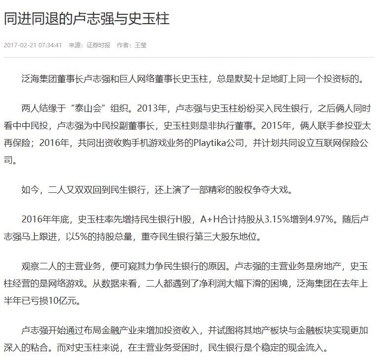 在民生银行股权争夺战中,史卢联手增持民生银行,而巨人网络想要收购以色列著名游戏公司Playtika,泛海资本拿出15亿美元支持。